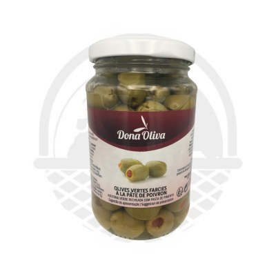 Les Olives Vertes Farcies à la Pâte de Poivron de la marque Dona Oliva proviennent du Portugal et sont vendues dans des bocaux de 200G.